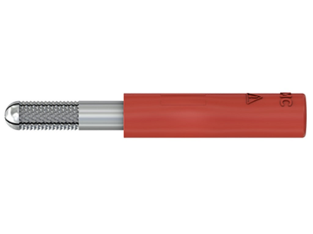 . Adapter, lavet af messing, kan skrues i Ø 4 mm fatninger. Det udvidelige Ø 4 mm stik på denne adapter kan låses i stikkontakten ved at stramme stiftskruen. Samlet giver adapteren komplet berøringssikker beskyttelse. Ø 4 mm stiv fatning i isolator, der accepterer fjederbelastede Ø 4 mm stik med stiv isoleringsmuffe.
