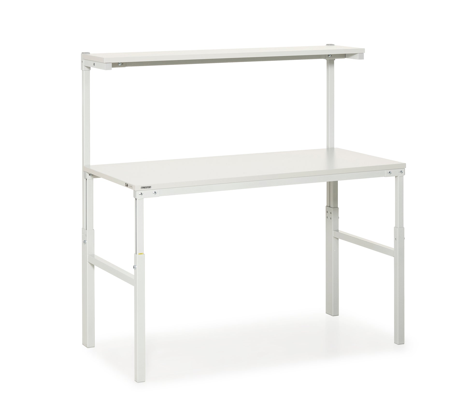 Denne beskrivelse gælder for TPH915 ESD fra TRESTON, et manuelt højdejusterbart arbejdsbord med én hylde. Produktet er udført med en bordplade i semiførende ESD-laminat og en pulverlakeret stålrundramme i farven RAL7035 (lysegrå).