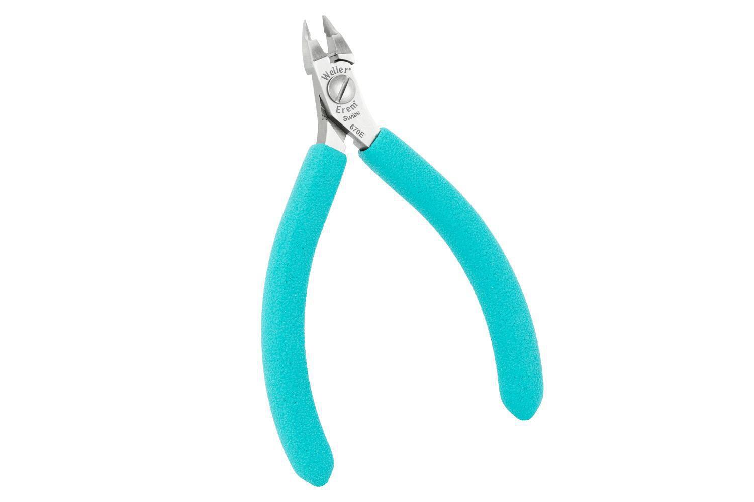 Denne 4-1/4" (110 mm) ESD-sikre flush straight short relieved head tip cutter fra EREM er model 670E i Weller Erem Series 600 Micro. 670E er en præcisionsminiatyrklipper designet til adgang i trange områder og opgivelser inden for mikroelektronik, med flush-skæring og en kort, aflastet spids.Materiale og konstruktion