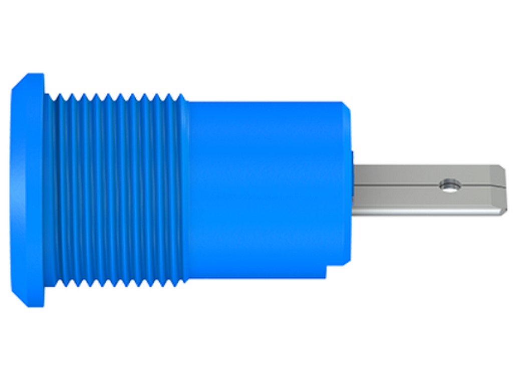 Isoleret, stiv, Ø 4 mm, accepterer fjederbelastede Ø 4 mm propper med stiv isoleringsmuffe. Bearbejdet messing. Fatningen skrues fast i forborede paneler af plast, metal mv. Tilslutning: Flad forbindelsesflig 4,8 mm × 0,8 mm, kan kun bøjes til 90