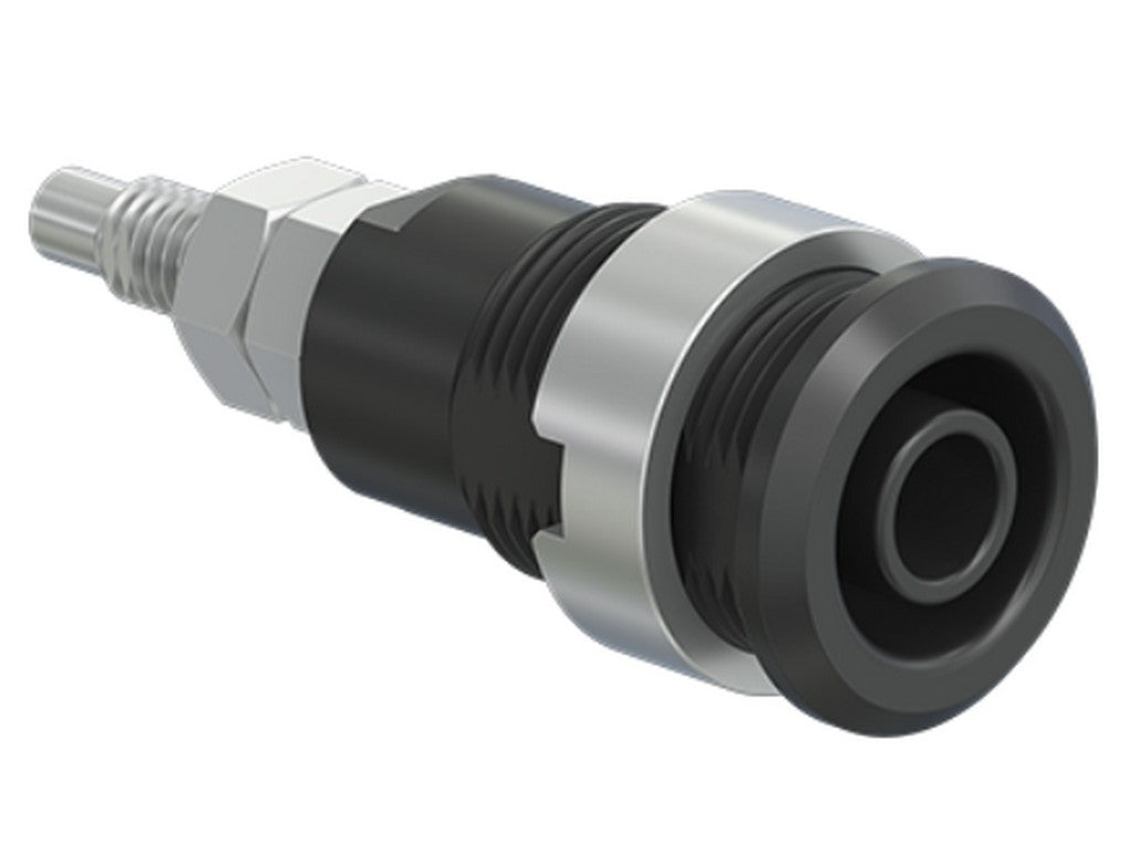 . Isoleret, stiv, Ø 4 mm, accepterer fjederbelastede Ø 4 mm propper med stiv isoleringsmuffe. Bearbejdet messing. Isoleringsmateriale UL94 V-0. Fatningen skrues i forborede paneler af plast, metal etc. Gevindbolt M4 og loddehul.