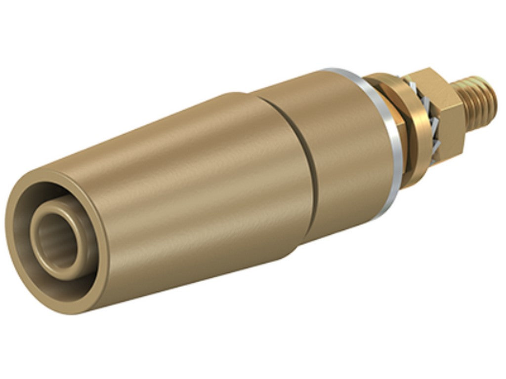 . Isoleret, stiv, Ø 4 mm, accepterer fjederbelastede Ø 4 mm propper med stiv isoleringsmuffe. Bearbejdet messing. Fatningen er overflademonteret i forborede plader af plast, metal etc. Gevindbolt M4.
