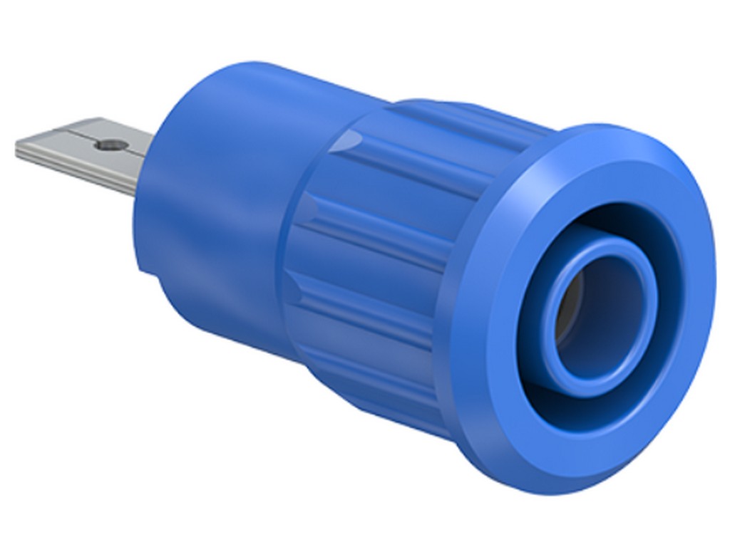 . Isoleret, stiv, Ø 4 mm, accepterer fjederbelastede Ø 4 mm propper med stiv isoleringsmuffe. Messingplade. Fatningen presses ind i forborede plader af plast, metal osv. Flad forbindelsesflig 4,8 mm × 0,8 mm, kan bøjes til 90°, én gang.