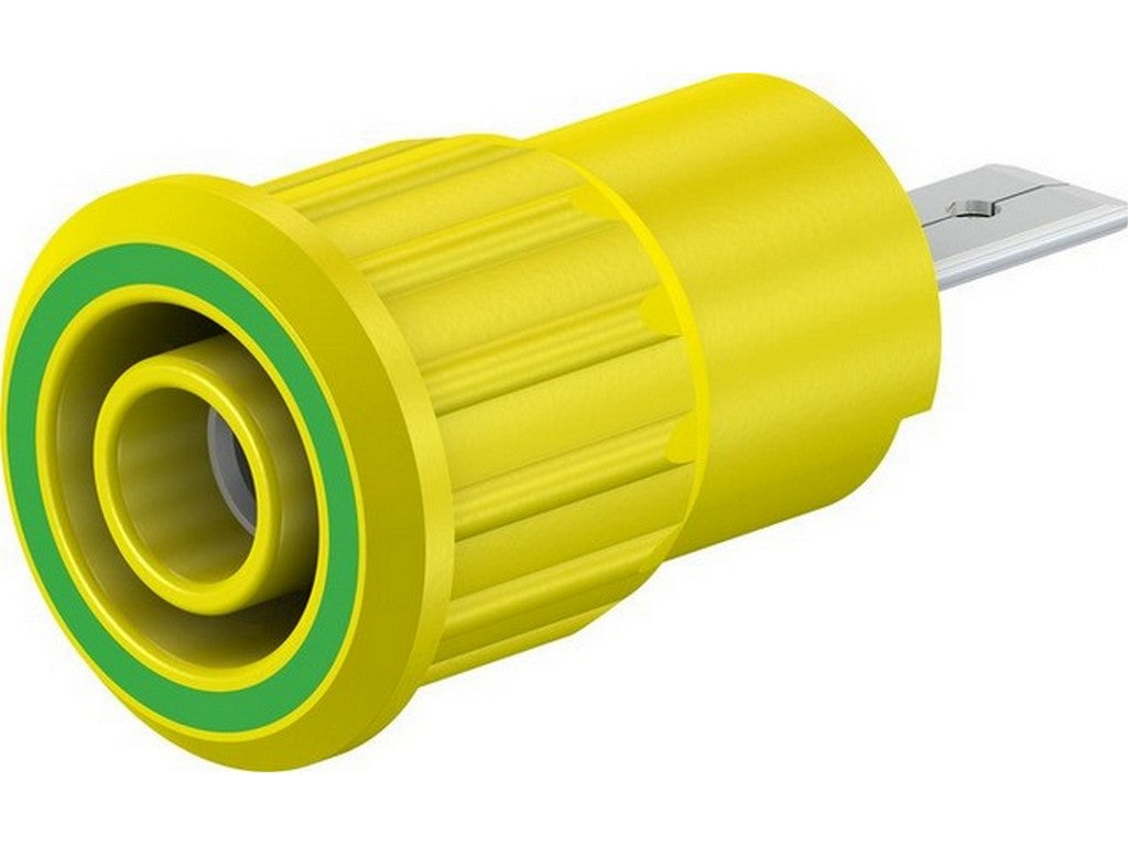 . Isoleret, stiv, Ø 4 mm, accepterer fjederbelastede Ø 4 mm propper med stiv isoleringsmuffe. Messingplade. Fatningen presses ind i forborede plader af plast, metal osv. Flad forbindelsesflig 4,8 mm × 0,8 mm, kan bøjes til 90°, én gang.