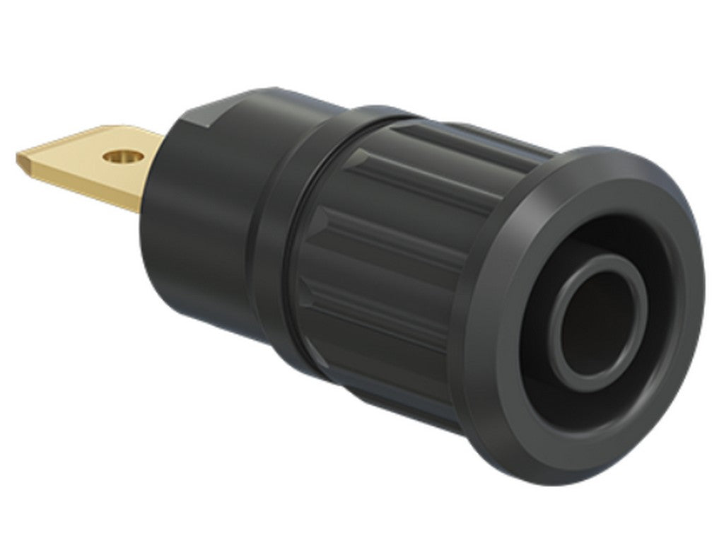 . Isoleret, stiv, Ø 4 mm, accepterer fjederbelastede Ø 4 mm propper med stiv isoleringsmuffe. Bearbejdet messing. Isoleringsmateriale UL94 V-0. Fatningen presses ind i forborede paneler af plast, metal etc. Flad forbindelsesflig 6,3 mm x 0,8 mm.