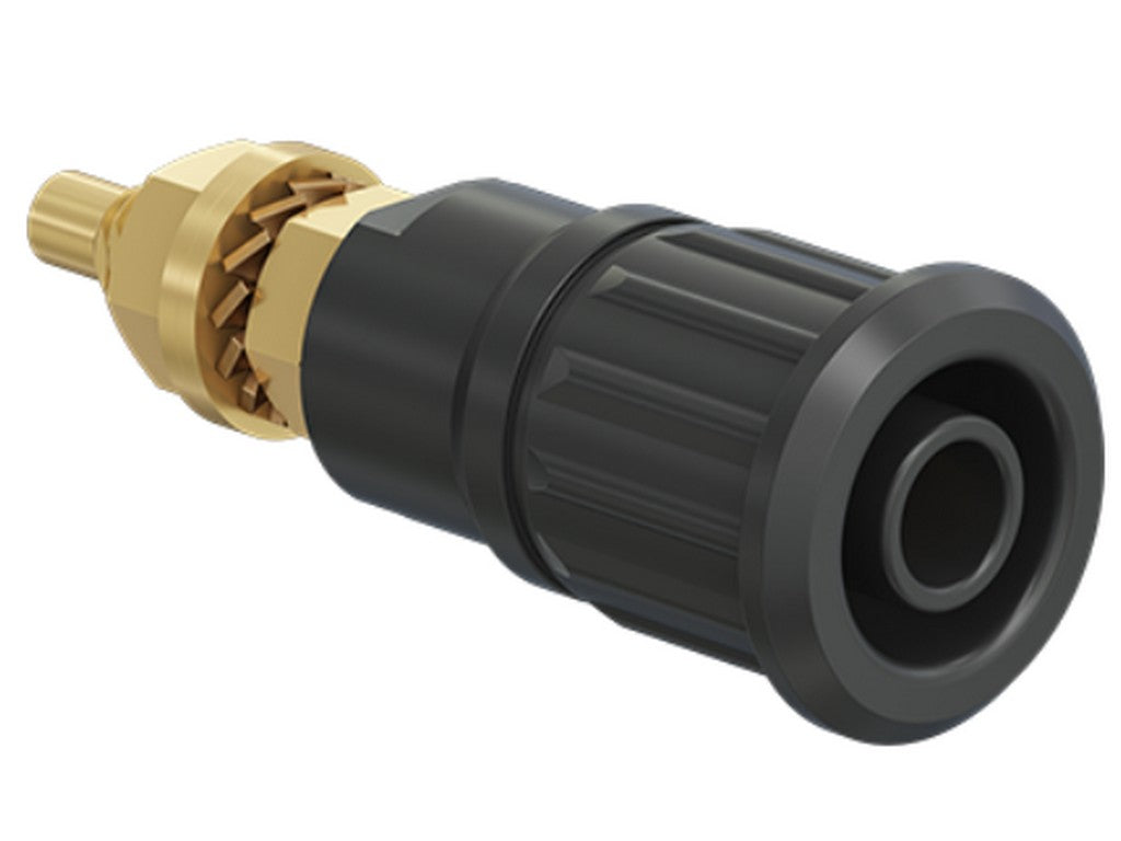 . Isoleret, stiv, Ø 4 mm, accepterer fjederbelastede Ø 4 mm propper med stiv isoleringsmuffe. Bearbejdet messing. Isoleringsmateriale UL94 V-0. Fatningen presses ind i forborede paneler af plast, metal etc. Gevindbolt M4 og loddehul.