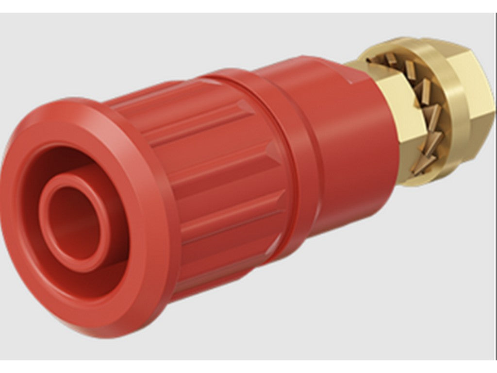 Isolerede, stive, Ø 4 mm, accepterer fjederbelastede Ø 4 mm propper med stiv isoleringsmuffe. Bearbejdet messing. Fatningen presses ind i forborede paneler af plast, metal mv.