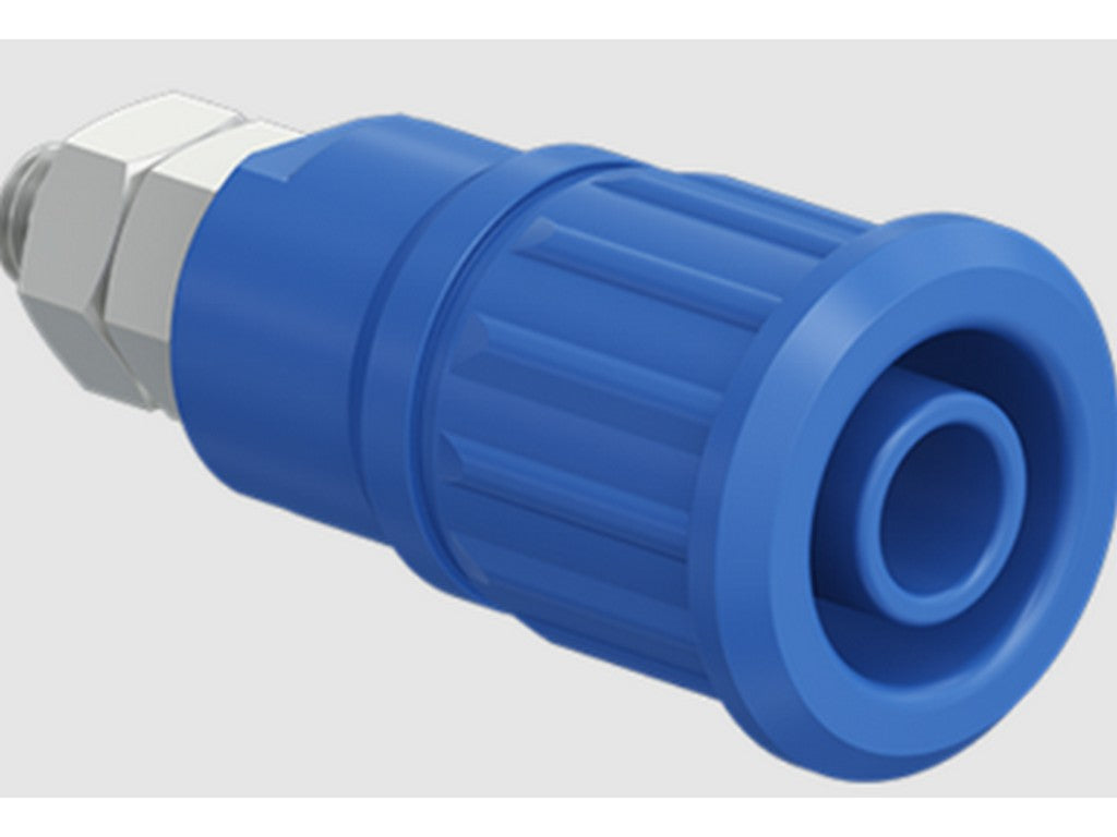 Isolerede, stive, Ø 4 mm, accepterer fjederbelastede Ø 4 mm propper med stiv isoleringsmuffe. Bearbejdet messing. Fatningen presses ind i forborede paneler af plast, metal mv. Tilslutning: Gevindbolt M4 og loddehul.