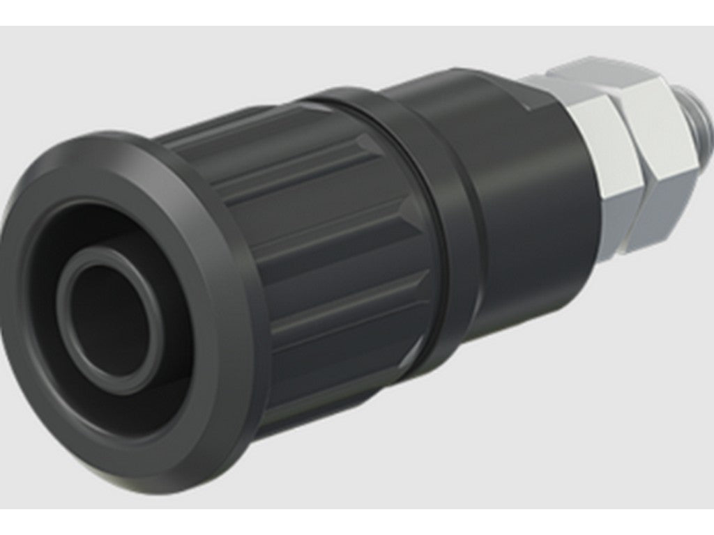 Isolerede, stive, Ø 4 mm, accepterer fjederbelastede Ø 4 mm propper med stiv isoleringsmuffe. Bearbejdet messing. Fatningen presses ind i forborede paneler af plast, metal mv.