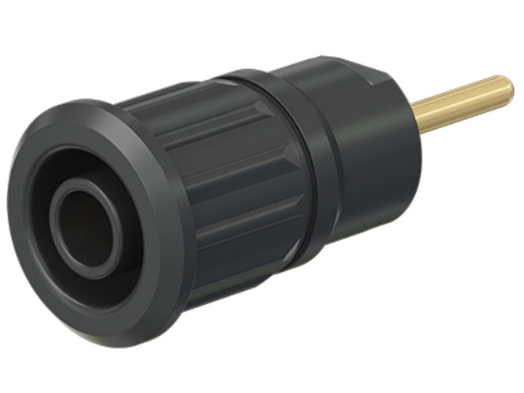 . Isoleret, stiv, Ø 4 mm, accepterer fjederbelastede Ø 4 mm propper med stiv isoleringsmuffe. Bearbejdet messing. Isoleringsmateriale UL94 V-0. Fatningen presses ind i forborede plader af plast, metal etc. Rund forbindelsesstift Ø 1,9 mm.