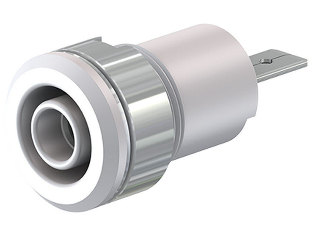 . Isoleret, stiv, Ø 4 mm, accepterer fjederbelastede Ø 4 mm propper med stiv isoleringsmuffe. Messingplade. Fatningen skrues ind i forborede plader af plast, metal osv. Flad forbindelsesflig 4,8 mm × 0,8 mm, kan bøjes til 90°, én gang.