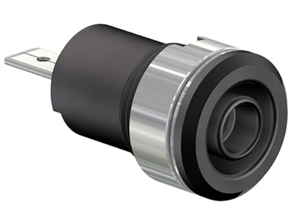 . Isoleret, stiv, Ø 4 mm, accepterer fjederbelastede Ø 4 mm propper med stiv isoleringsmuffe. Messingplade. Fatningen skrues ind i forborede plader af plast, metal osv. Flad forbindelsesflig 4,8 mm × 0,8 mm, kan bøjes til 90°, én gang.