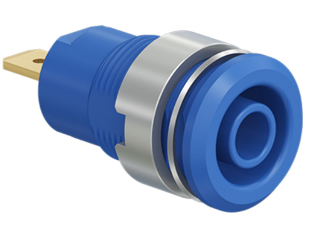 . Isoleret, stiv, Ø 4 mm, accepterer fjederbelastede Ø 4 mm propper med stiv isoleringsmuffe. Bearbejdet messing. Isoleringsmateriale UL94 V-0. Fatningen skrues ind i forborede paneler af plast, metal osv. Flad forbindelsesflig 4,8 mm × 0,8 mm.
