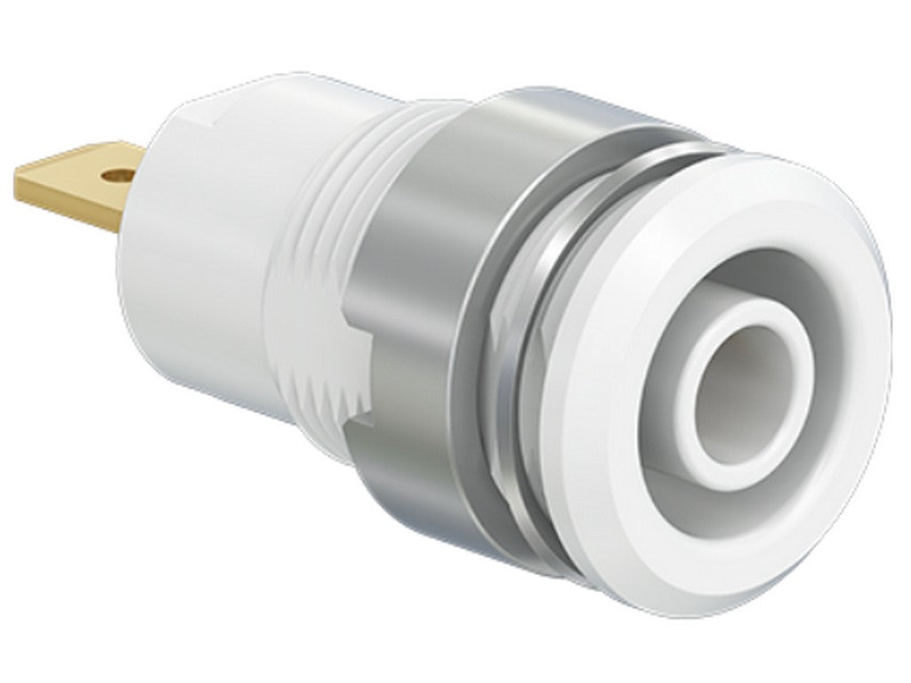 . Isoleret, stiv, Ø 4 mm, accepterer fjederbelastede Ø 4 mm propper med stiv isoleringsmuffe. Bearbejdet messing. Isoleringsmateriale UL94 V-0. Fatningen skrues ind i forborede paneler af plast, metal osv. Flad forbindelsesflig 4,8 mm × 0,8 mm.