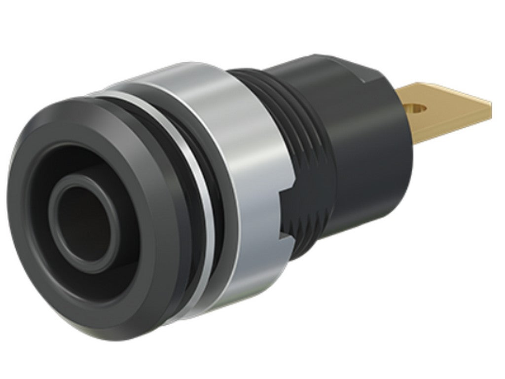 . Isoleret, stiv, Ø 4 mm, accepterer fjederbelastede Ø 4 mm propper med stiv isoleringsmuffe. Bearbejdet messing. Isoleringsmateriale UL94 V-0. Fatningen skrues i forborede paneler af plast, metal etc. Flad forbindelsesflig 6,3 mm x 0,8 mm.