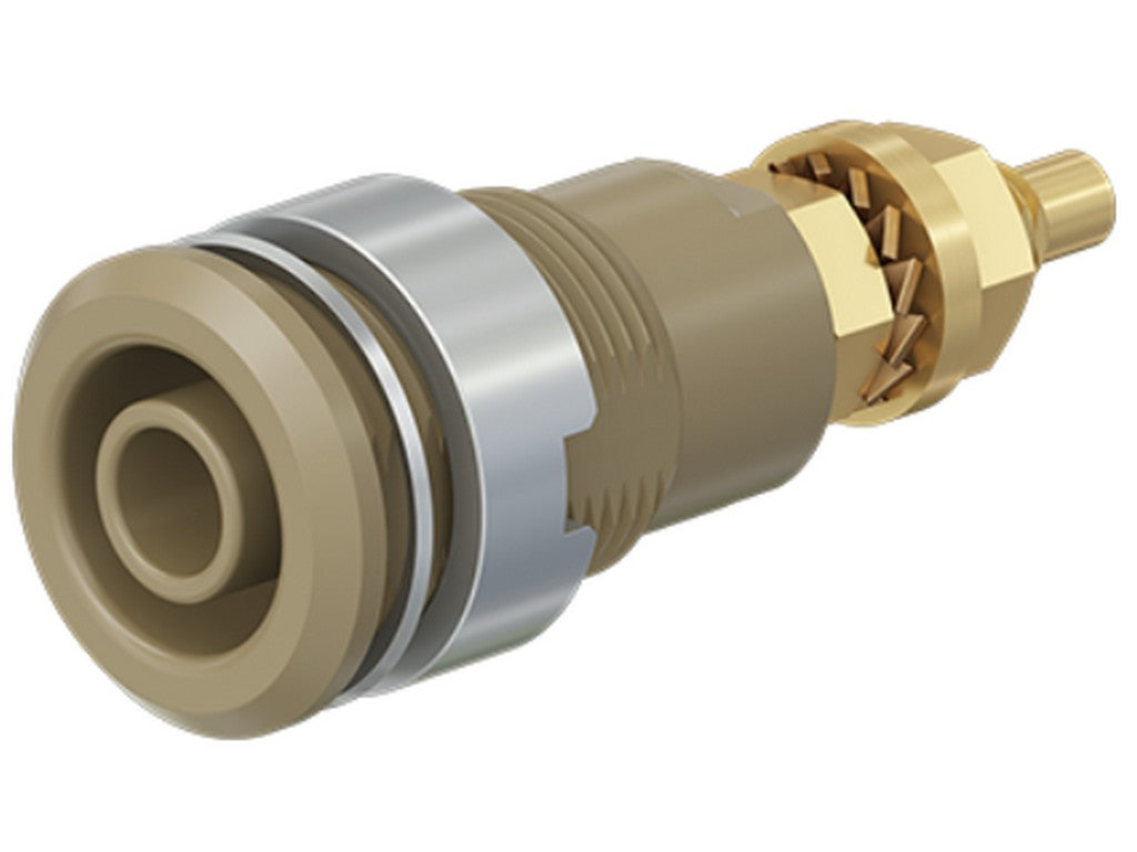 . Isoleret, stiv, Ø 4 mm, accepterer fjederbelastede Ø 4 mm propper med stiv isoleringsmuffe. Bearbejdet messing. Isoleringsmateriale UL94 V-0. Fatningen skrues i forborede paneler af plast, metal etc. Gevindbolt M4 og loddehul.