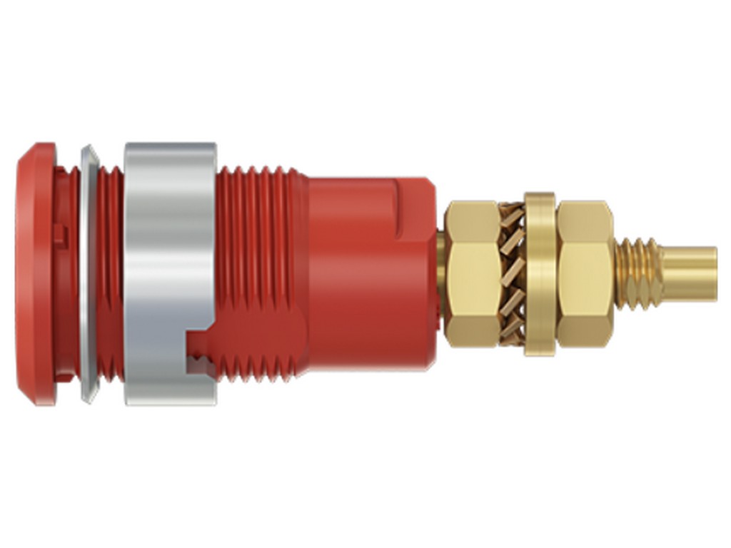 . Isoleret, stiv, Ø 4 mm, accepterer fjederbelastede Ø 4 mm propper med stiv isoleringsmuffe. Bearbejdet messing. Isoleringsmateriale UL94 V-0. Fatningen skrues i forborede paneler af plast, metal etc. Gevindbolt M4 og loddehul.