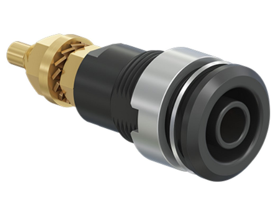 . Isoleret, stiv, Ø 4 mm, accepterer fjederbelastede Ø 4 mm propper med stiv isoleringsmuffe. Bearbejdet messing. Isoleringsmateriale UL94 V-0. Fatningen skrues i forborede paneler af plast, metal etc. Gevindbolt M4 og loddehul.