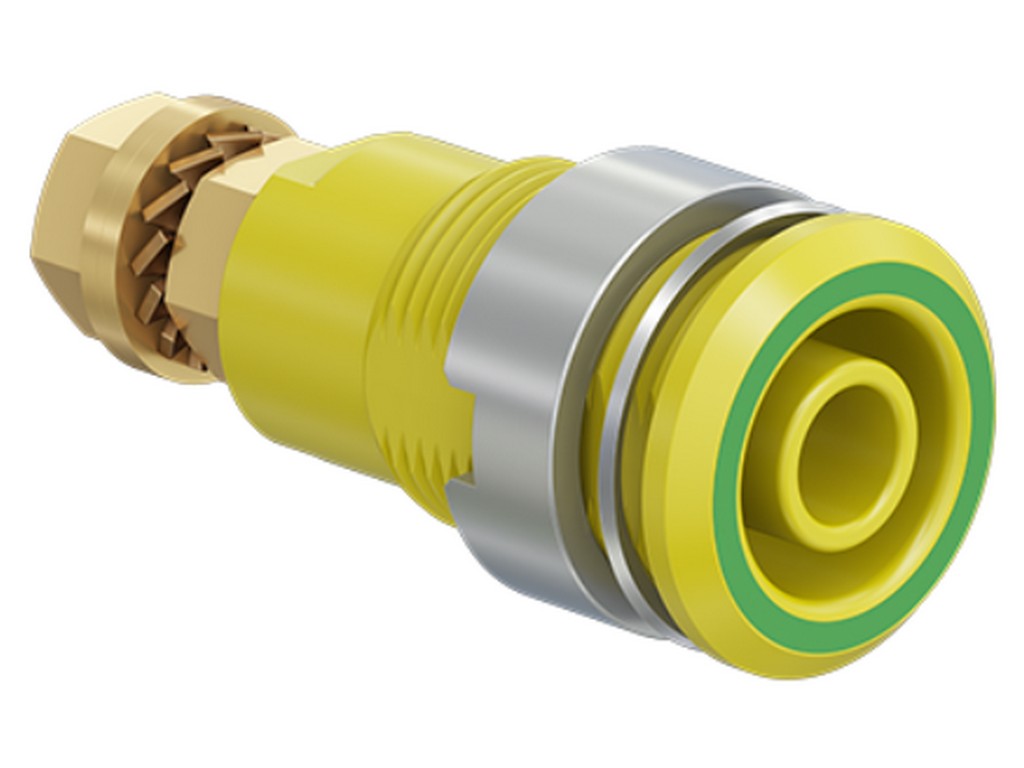 Isoleret, stiv, Ø 4 mm, accepterer fjederbelastede Ø 4 mm propper med stiv isoleringsmuffe. Bearbejdet messing. Isoleringsmateriale UL94 V-0. Fatningen skrues i forborede paneler af plast, metal osv. Tilslutning: Gevindbolt M4 og loddehul