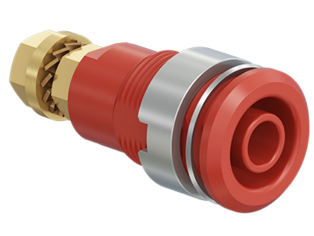 Isoleret, stiv, Ø 4 mm, accepterer fjederbelastede Ø 4 mm propper med stiv isoleringsmuffe. Bearbejdet messing. Isoleringsmateriale UL94 V-0. Fatningen skrues fast i forborede paneler af plast, metal mv. Tilslutning: Gevindbolt M4 og loddehul.
