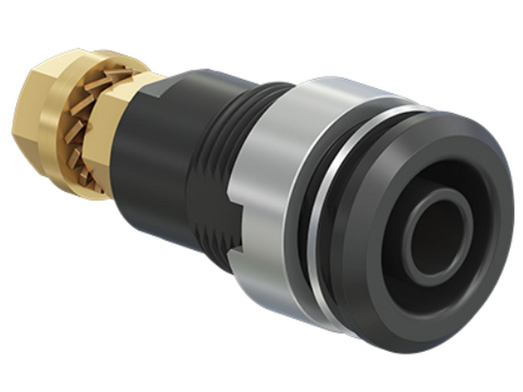 Isoleret, stiv, Ø 4 mm, accepterer fjederbelastede Ø 4 mm propper med stiv isoleringsmuffe. Bearbejdet messing. Isoleringsmateriale UL94 V-0. Fatningen skrues i forborede paneler af plast, metal osv. Tilslutning: Gevindbolt M4 og loddehul
