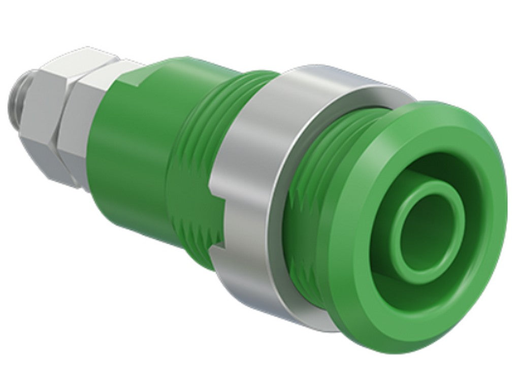 Isoleret, stiv, Ø 4 mm, accepterer fjederbelastede Ø 4 mm propper med stiv isoleringsmuffe. Bearbejdet messing. Isoleringsmateriale UL94 V-0. Fatningen skrues i forborede paneler af plast, metal mv. Tilslutning: Gevindbolt M4 og loddehul.
