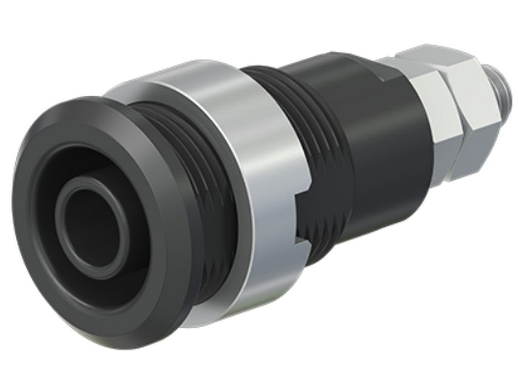 Isoleret, stiv, Ø 4 mm, accepterer fjederbelastede Ø 4 mm propper med stiv isoleringsmuffe. Bearbejdet messing. Isoleringsmateriale UL94 V-0. Fatningen skrues i forborede paneler af plast, metal mv