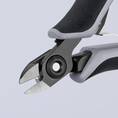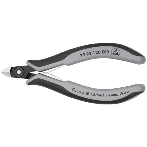Denne præcisions-diagonalskærer til elektronik fra KNIPEX er beregnet til nøjagtig afkortning af ledere og komponentben. KNIPEX 79 22 120 ESD er angivet som en 4 3/4" (120 mm) værktøjslængde med ESD-afledende multi-komponent håndtag, der sikrer afledning af elektrostatisk energi via håndtagene.