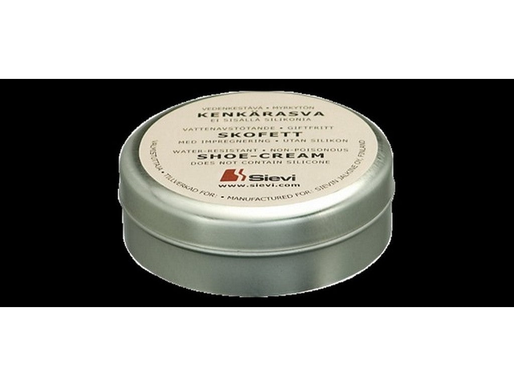 Denne artikel er en skokrem identificeret som "Shoe cream 125 ml" fra SIEVI beregnet til behandling af læder og sømme. Produktet leveres i en emballage på 125 ml og er angivet som non-toxic samt uden silikone. Produktidentifikation på producentens side omfatter produktkode 00-99400-000-000 og GTIN 6438157026194.
