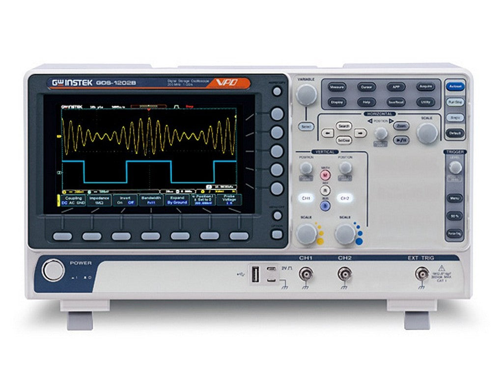 7” TFT farve display. Max. input 300V Sampling: real-time 1GSa/s Interface USB (kabel medfølger ikke) 10:1/1:1 probe medfølger.