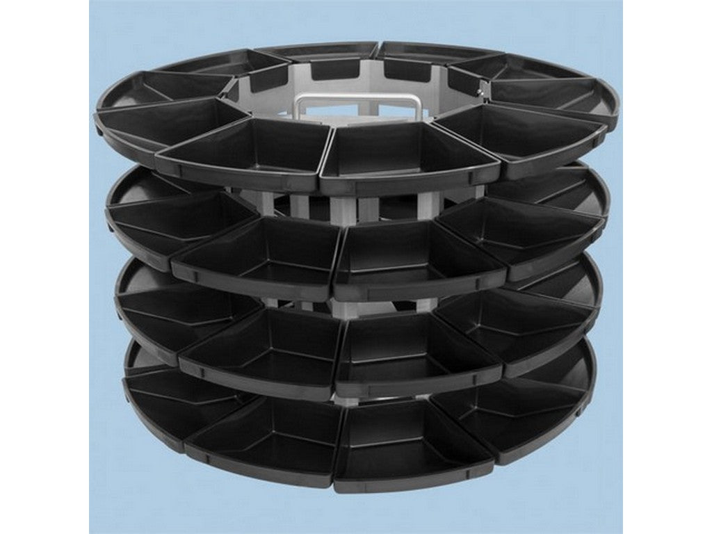 Denne skraldespandskarrusel er specielt velegnet til overskuelig klargøring og enkel afmontering af fx elektroniske komponenter, skruer osv. Grundelementet indeholder 40 spande (4 niveauer), som er anbragt på en kuglelejeholder. De kan nemt udskiftes, men de kan ikke vendes uafhængigt. På grund af et håndtag på oversiden kan karrusellen transporteres komfortabelt.