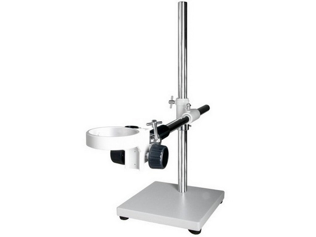 Ledformet enarms bomstativ med 270 x 270 mm bund, 610 mm og ø 29 mm søjle, med grovjustering og orienterbar stereohovedholder. Lodret stolpe 780 mm.