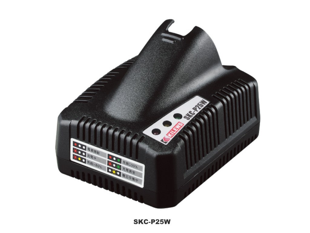 Denne ladestation fra KILEWS, model SKC-P25W, er designet til opladning af KILEWS SKC-LB0730S lithium-ion batteri. SKC-P25W accepterer 100–240 VAC indgang og leverer en 8.4 VDC, 3.0 A udgang. Enheden indeholder batteriidentifikation og en akustisk buzzer samt CE- og ETL-mærkninger, som angivet i producentens driftshåndbog.