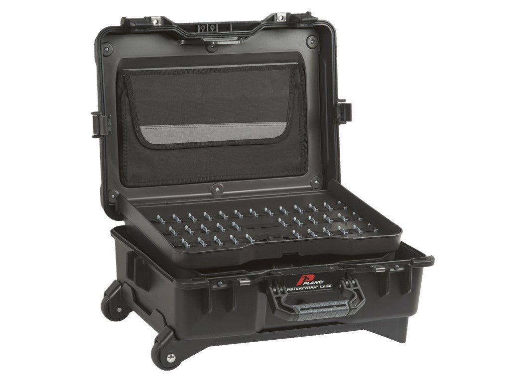 Professionel vandtæt IP67 værktøjsvogn PLANO Vandtætte etuier har flyselskabs håndbagagestørrelser. Slagfast Knussikker hængelås, Støvtæt rustfrit stål hardware Højtydende pakning Stabelbar Dokumentopbevaringsrum med små lommer 2 værktøjsholderpaneler med elastiske holdere Bund med modulopbyggede rum Ergonomisk håndtag med blødt, skridsikkert greb Udtrækkelig trolley Hjul med gummislidbane.