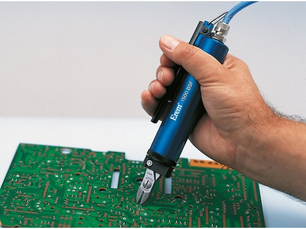 1500BSF er beskrevet som et let og præcist pneumatisk værktøj med udskiftelige klippehoveder. Produktteksten angiver, at cutter-huset er egnet til brug med forskellige hoveder og at den samlede konstruktion er designet til præcis klipning af små komponenter. Ifølge producentdata er værktøjet ESD-sikkert.