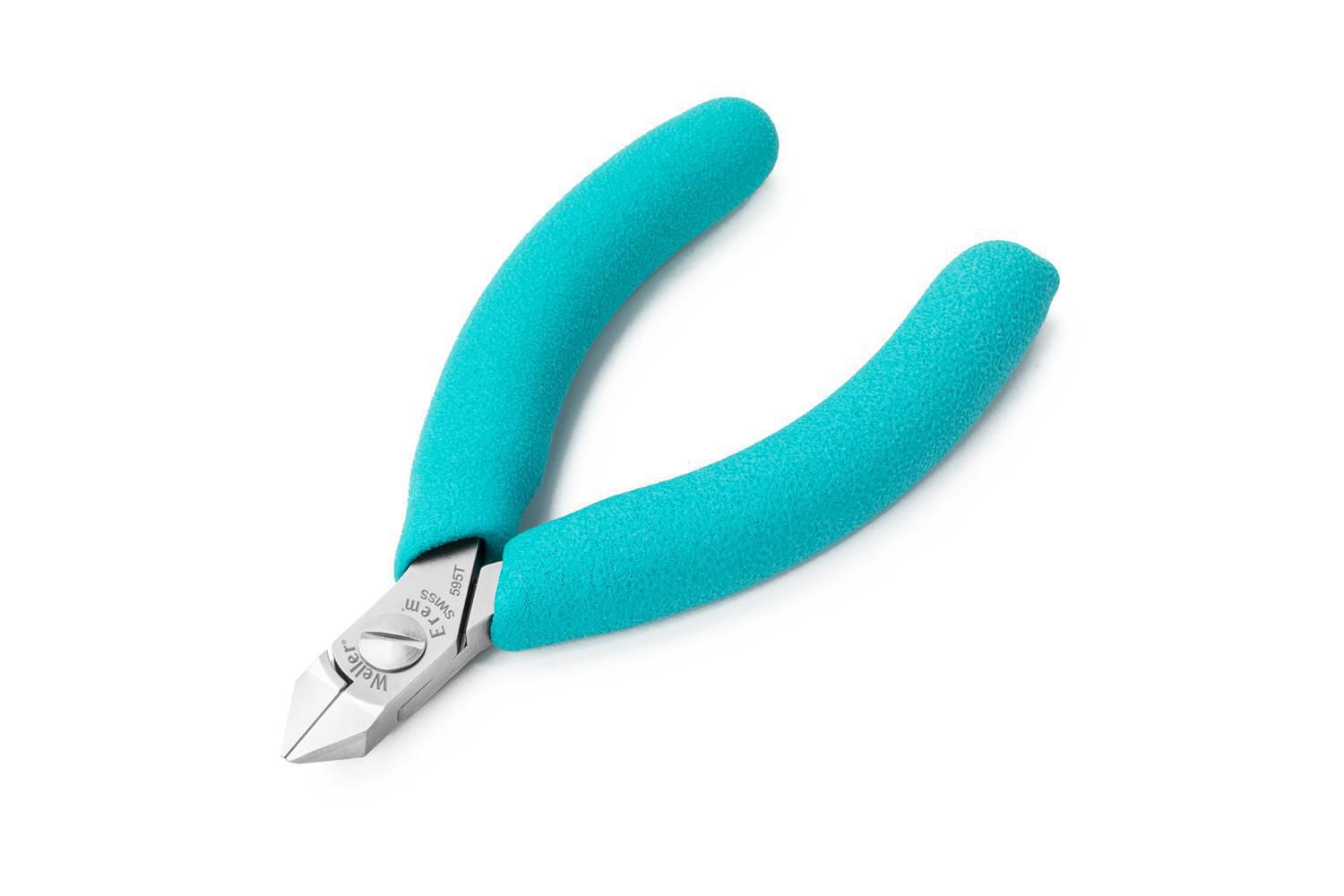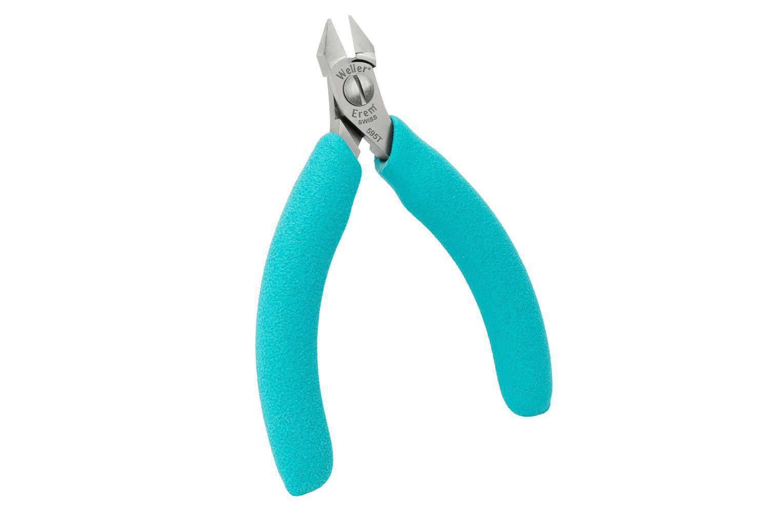 Itemnummer 595T er en diagonal semi-flush cut cutter (4-1/4" / 115 mm) fra Weller Erem Series 500 Micro. Produktet er beskrevet af producenten som en medium-størrelse præcisionsklipper med karbidindsatser langs skærekantene og er beregnet til præcisionsarbejde.