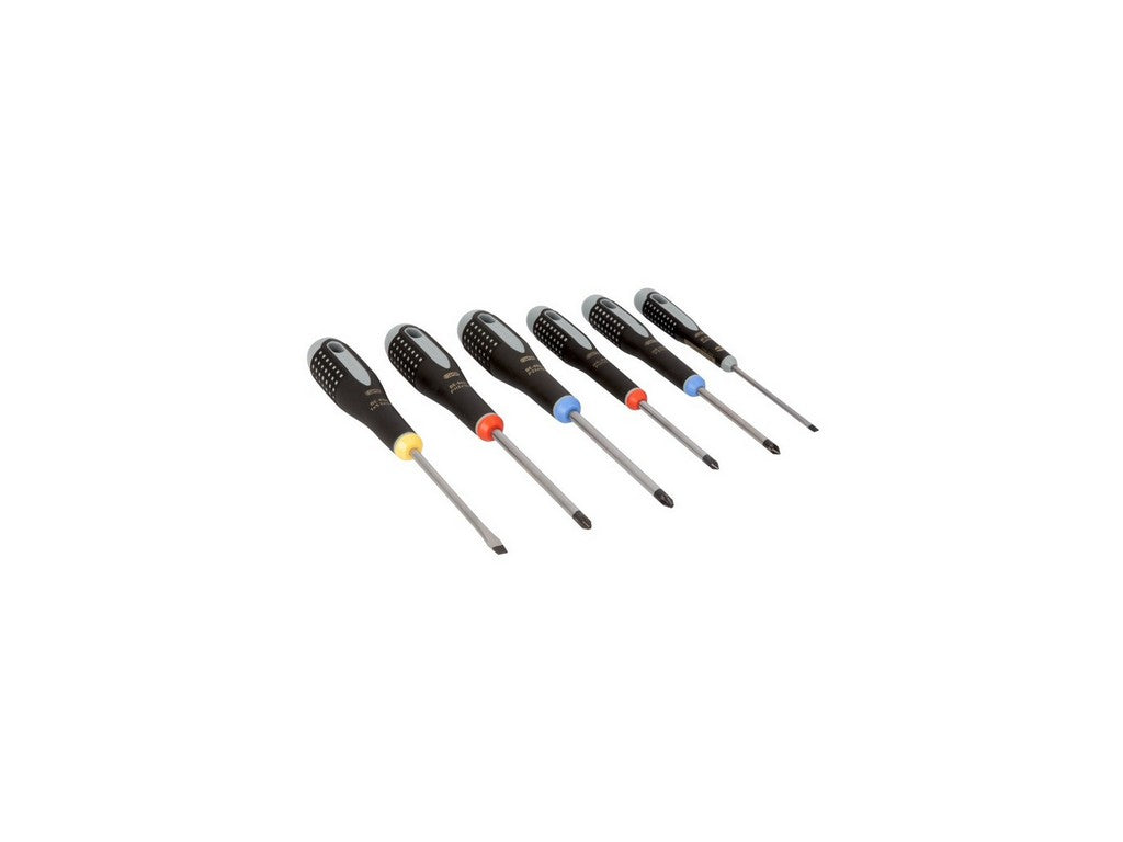 BE-9876S er et 14-delt ERGO™ skruetrækkersæt fra BAHCO. Sættet indeholder flad (slotted), Phillips (PH), Pozidriv (PZ), TORX® og plus-minus/Combi PZ skruetrækkere med gummibelagt tre-komponent håndtag. Beskrivelsen nedenfor baserer sig på producentens produkttekst.Design og materialer