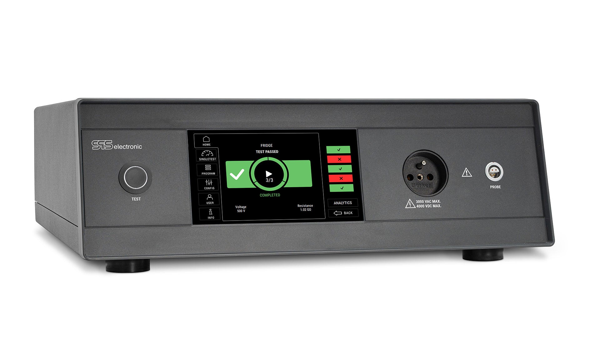 Denne universal safety tester S 6600U fra SPS-ELECTR er en desktop-enhed med laboratoriestik og højvoltsstik placeret på frontpanelet. Enheden udfører kontrollerede elektriske sikkerhedsprøver og omfatter både AC- og DC-højvoltsprøvning, isolationstest og jordforbindelsestest som specificeret af producenten.Typiske anvendelser