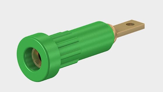 Insulated, Ø 2 mm rigid socket made of machined brass. The socket is pressed into predrilled panels of plastic, metal etc. Connection: Flat connecting tab 2.8 mm x 0.8 mm.