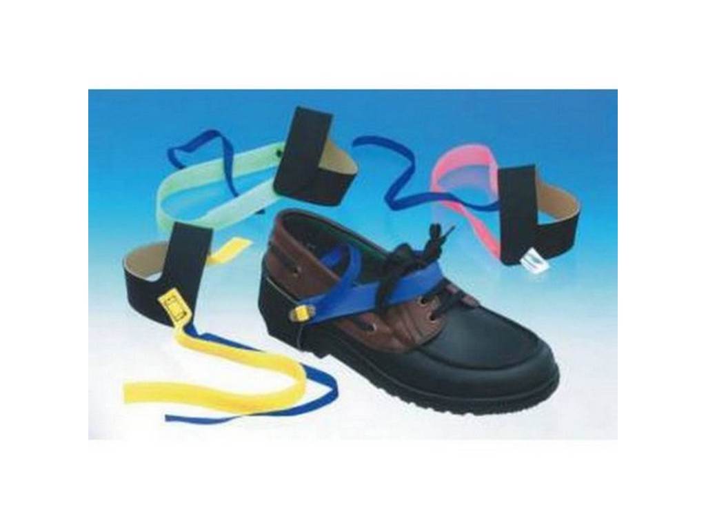 - Jordingsstrop: gummistroppen føres under og rundt om skoens bagkant og fastgøres ovenpå skoen med en gul hook-and-loop rem.