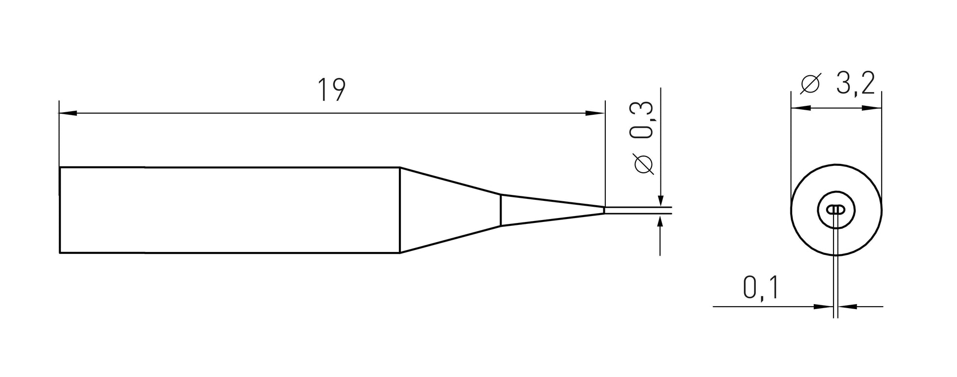Denne loddespids fra WELLER er en RTMS Micro loddespids (RTMS 003 S NW MS, varenummer T0050115299) designet til præcis manuel lodning. RTMS Micro soldering tip er udført i mejsel-form med dimensionerne Ø 0.3 x 0.1 mm og er angivet som "not wettable" og MIL‑SPEC-kompatibel i producentens datablad. Kort tip-til-greb afstand og optimeret form er nævnt som medvirkende til maksimal præcision.Tekniske egenskaber og identifikation