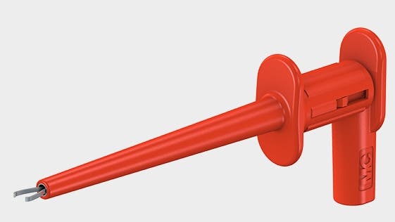 . With hardened spring wire grabber with gold-plated contact area. Ø 2 mm rigid socket in handle accepting spring-loaded Ø 2 mm plugs with rigid insulating sleeve.